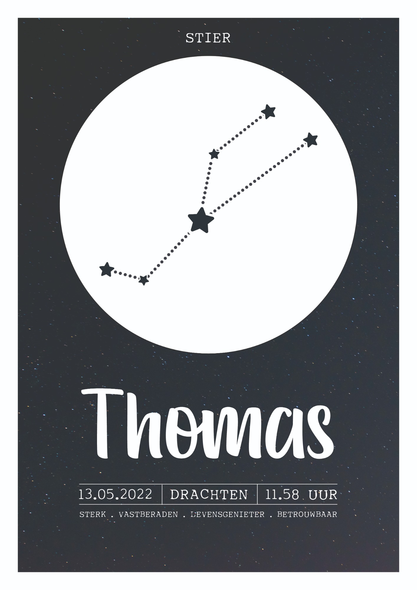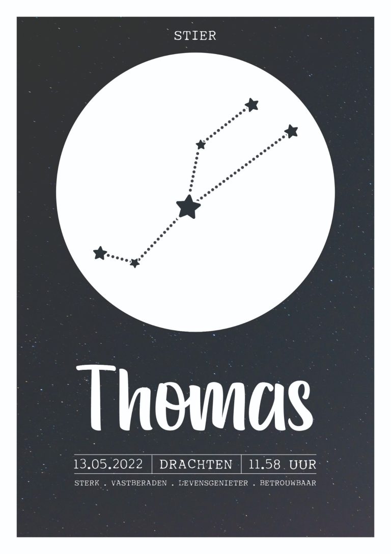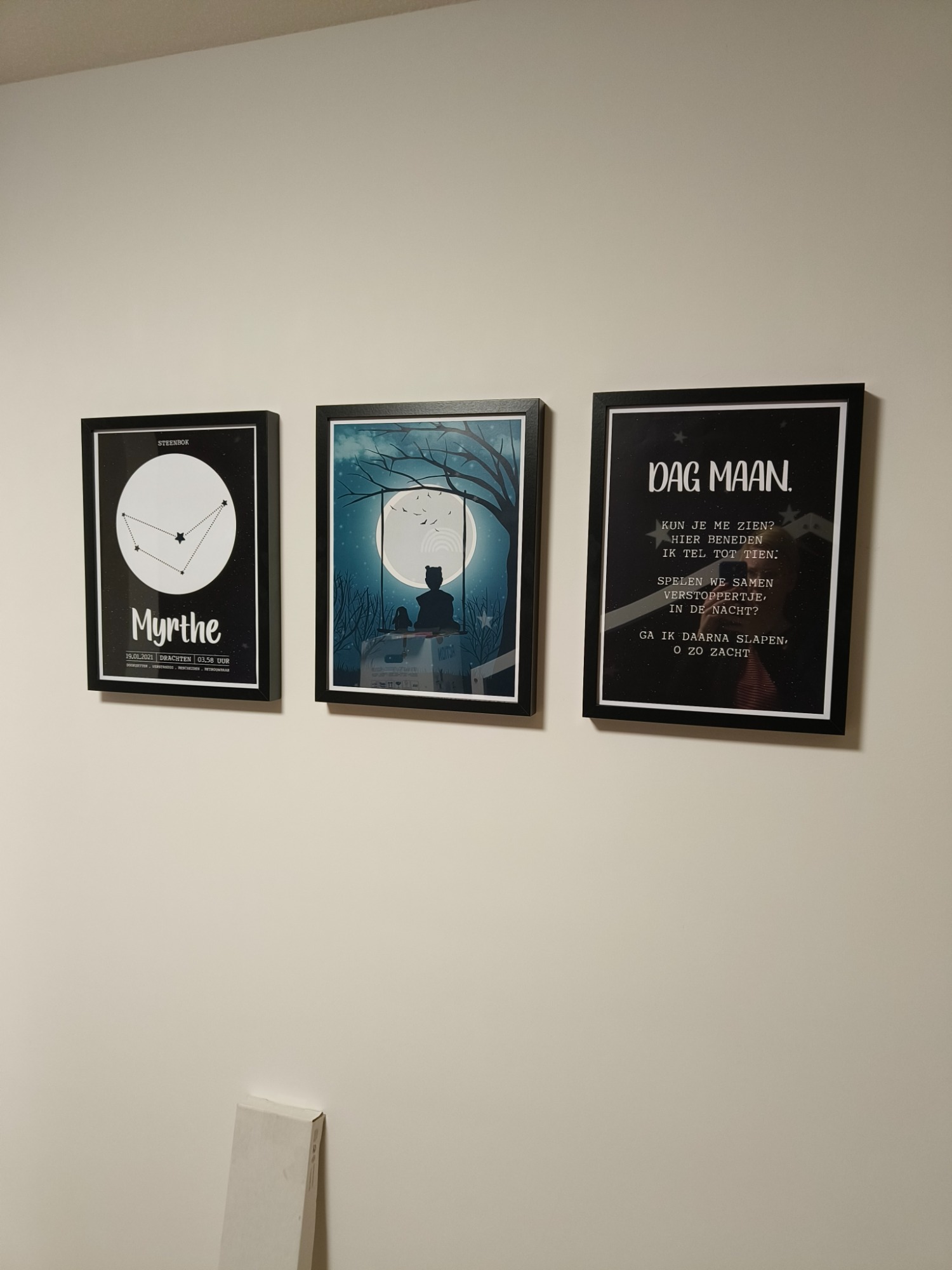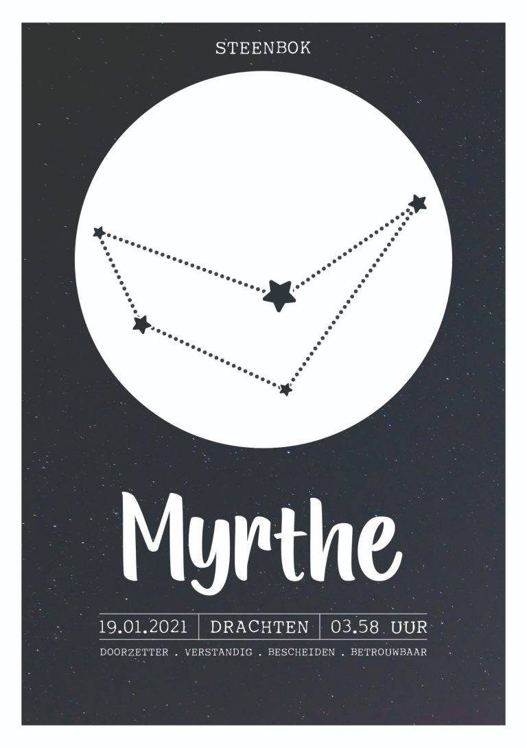 Op de derde schittert hun sterrenbeeld, inclusief betekenis, geboorteplaats, datum en het precieze tijdstip. Alle 6 posters zijn ingelijst in een mooie zwarte lijst dat weer goed past bij het interieur van het huis/slaapkamers.