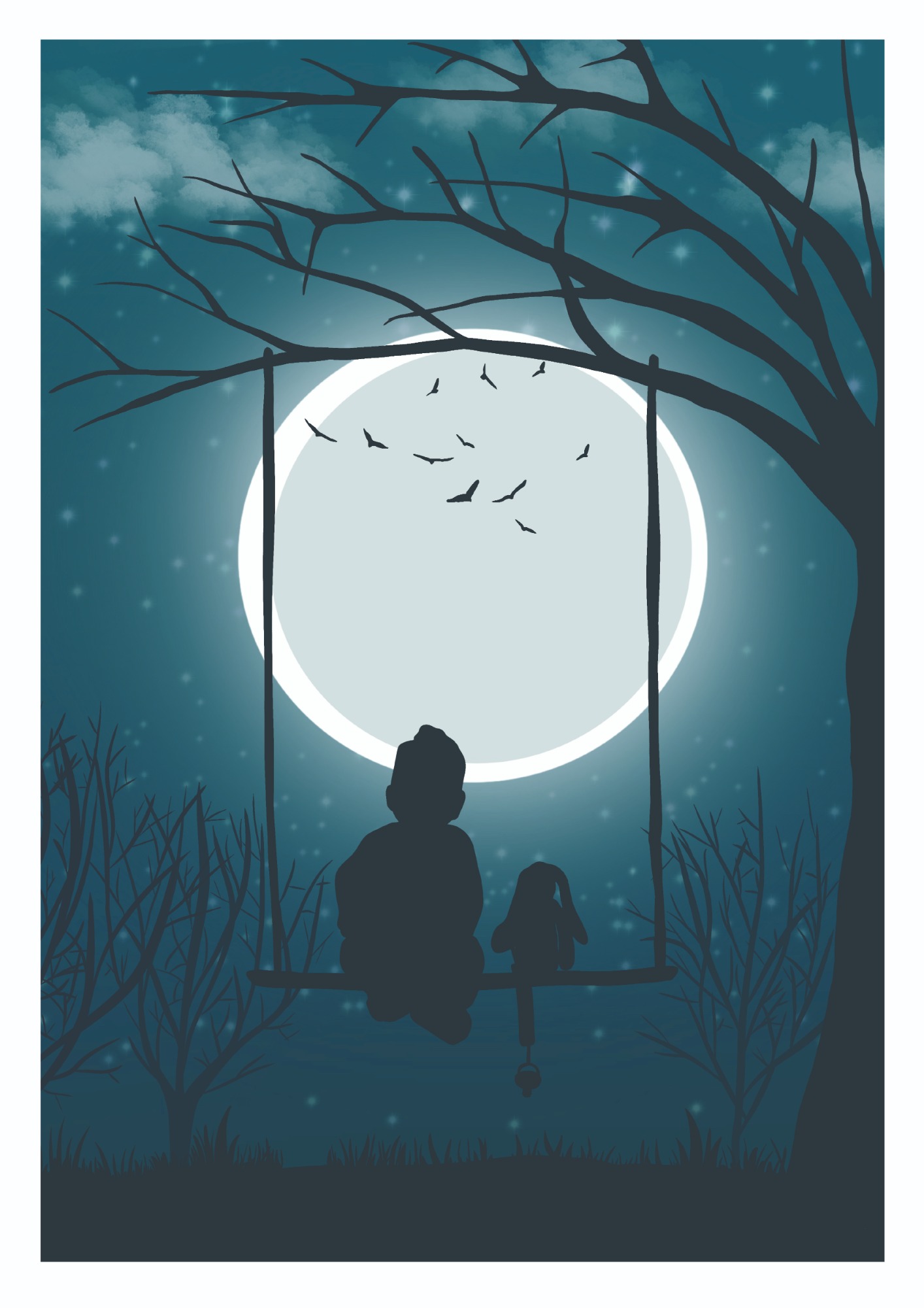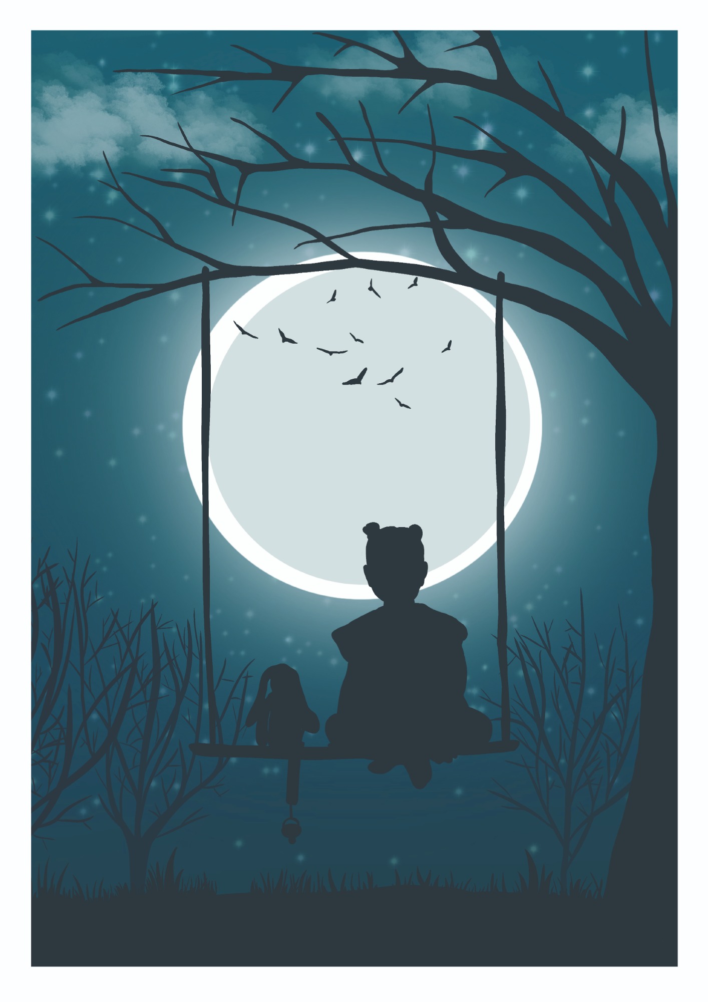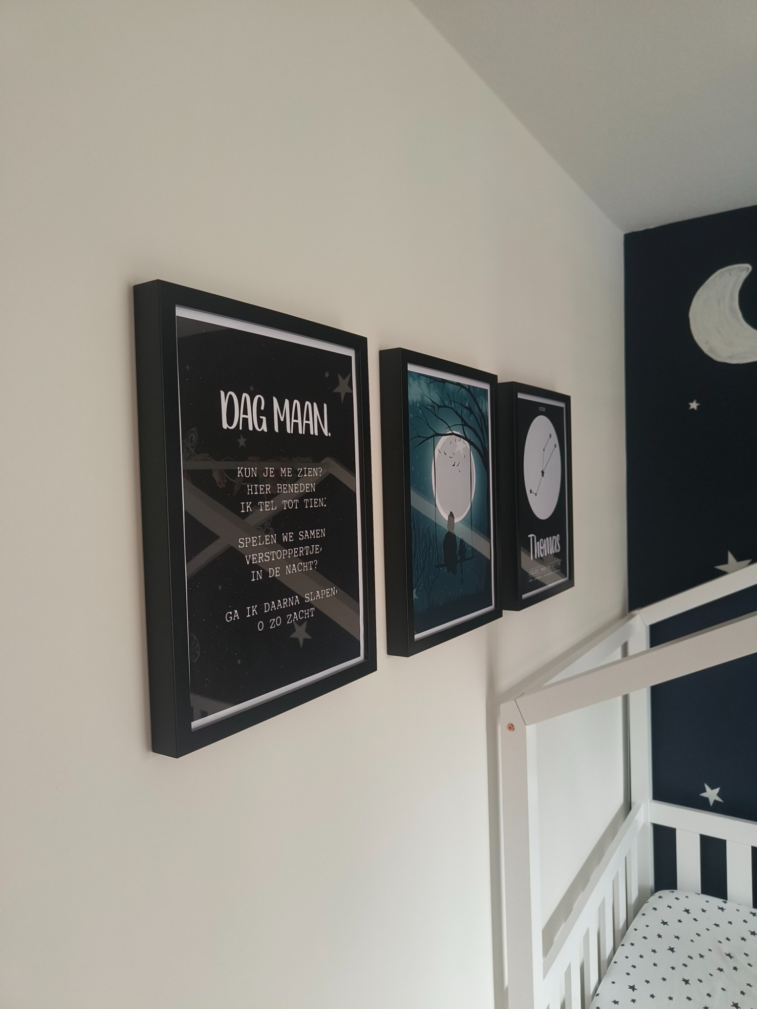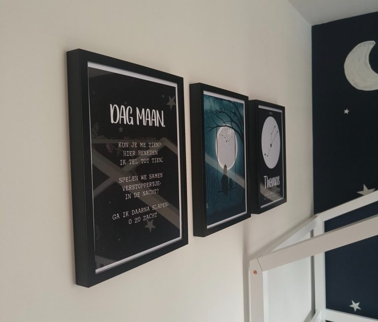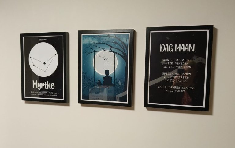 De eerste poster toont hun silhouet, liefdevol vastgelegd met hun favoriete knuffel en speentje. De tweede poster heeft een speciaal gedicht, over de maan.