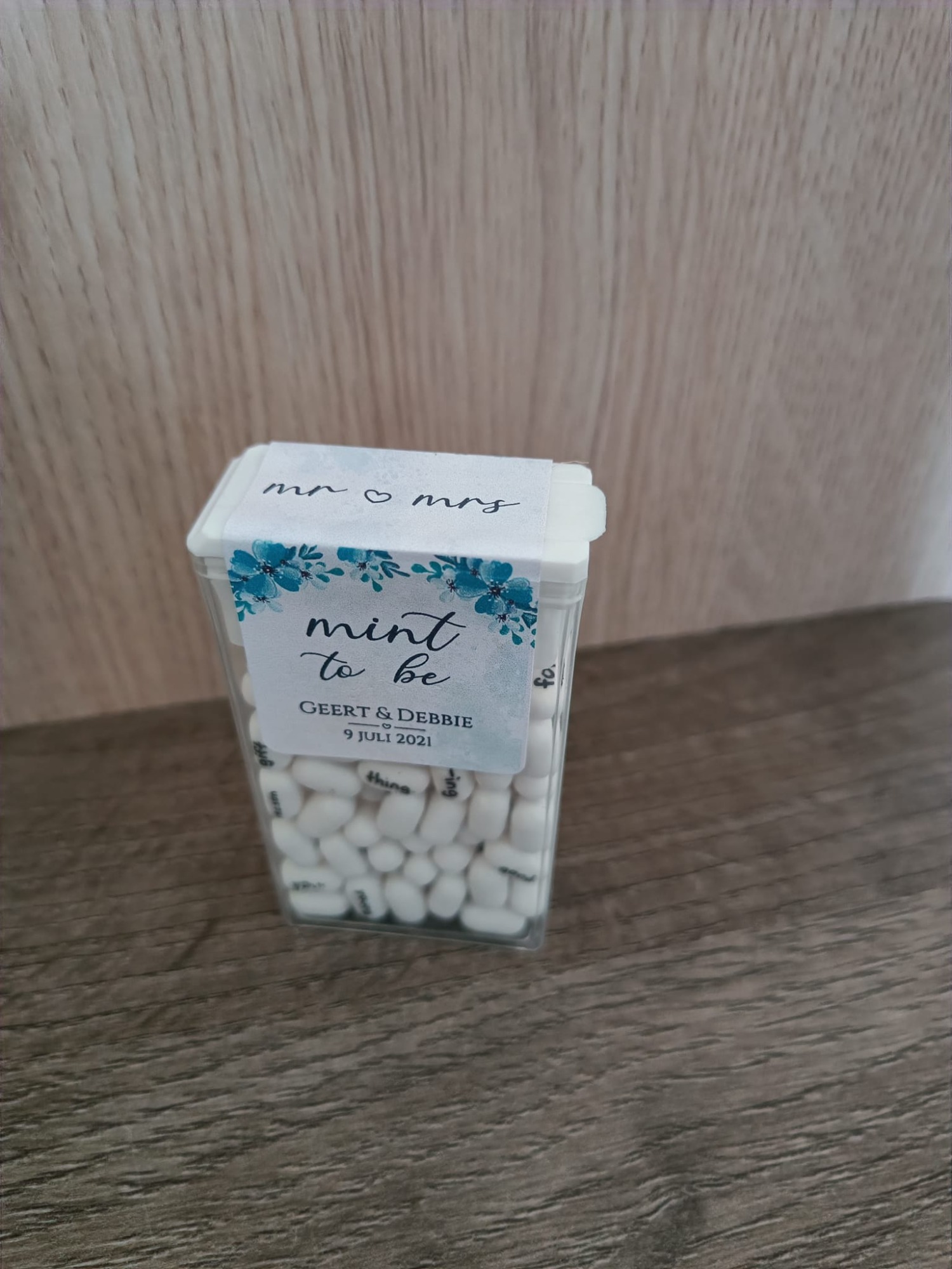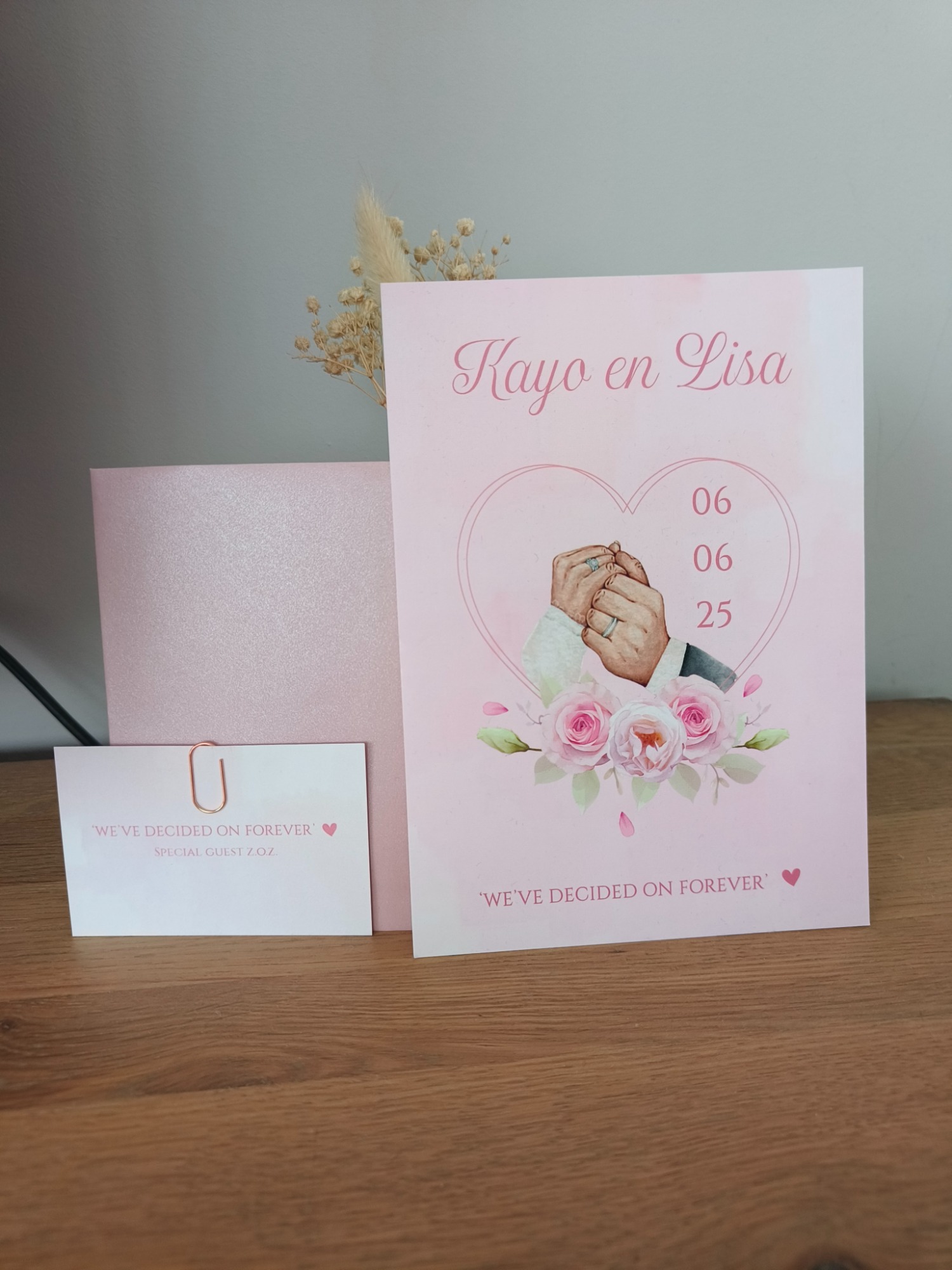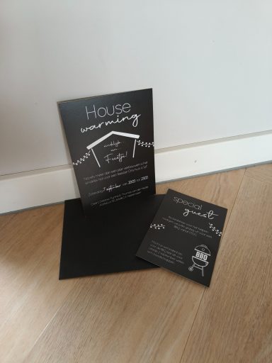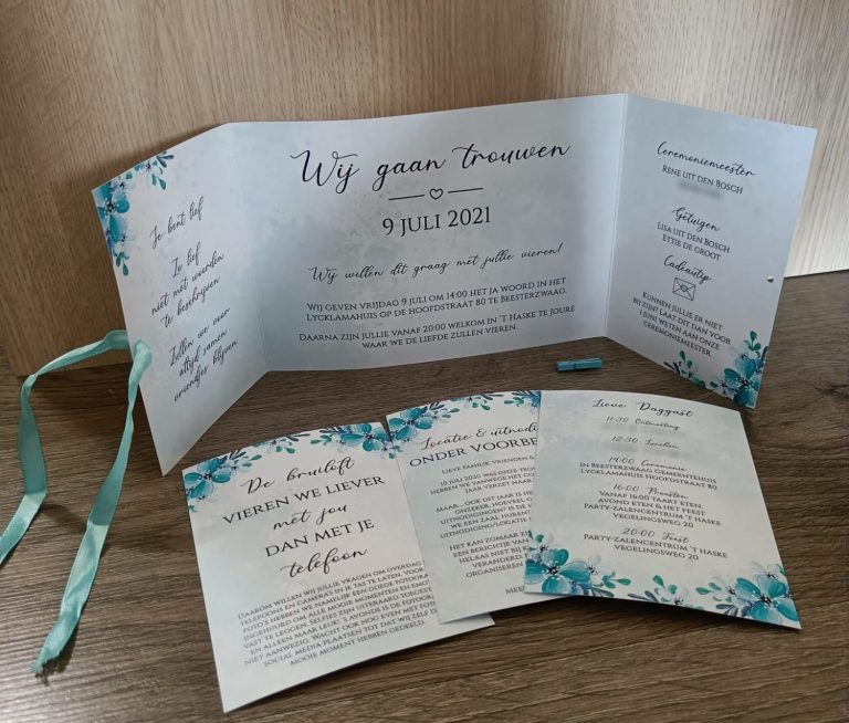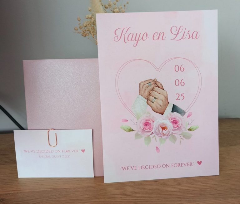 Voor mijn eigen bruiloft heb ik uiteraard ook de kaart ontworpen. We zaten toen midden in de corona tijd en daarom hadden we een aparte onder voorbehoud kaart, maar goed ook want we hebben het een jaar moeten uitstellen.