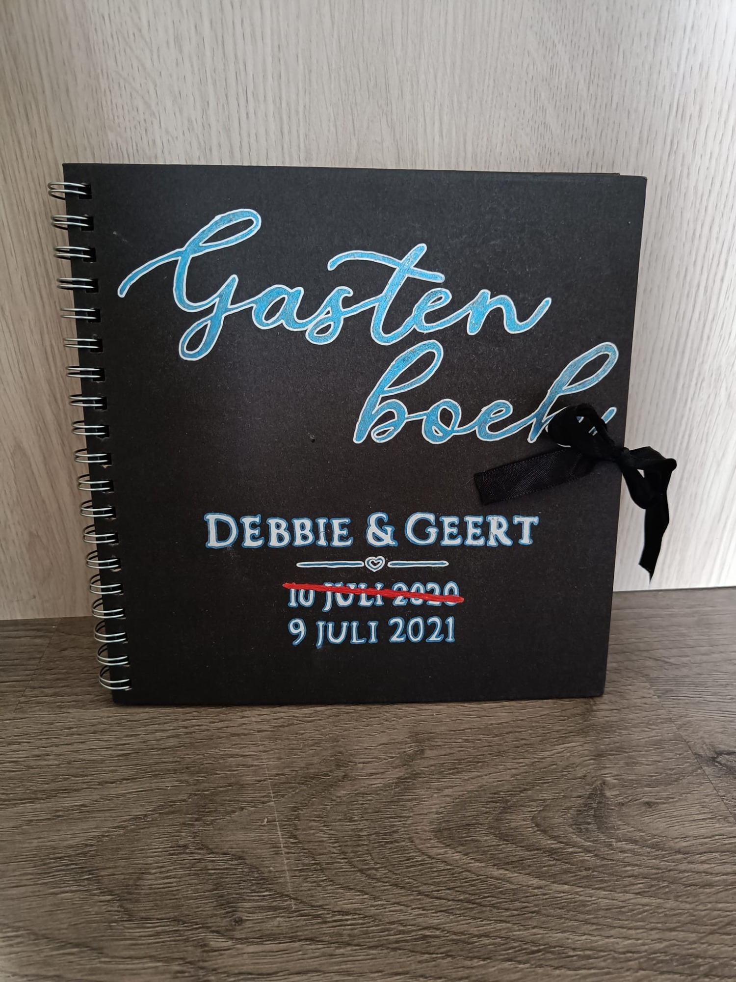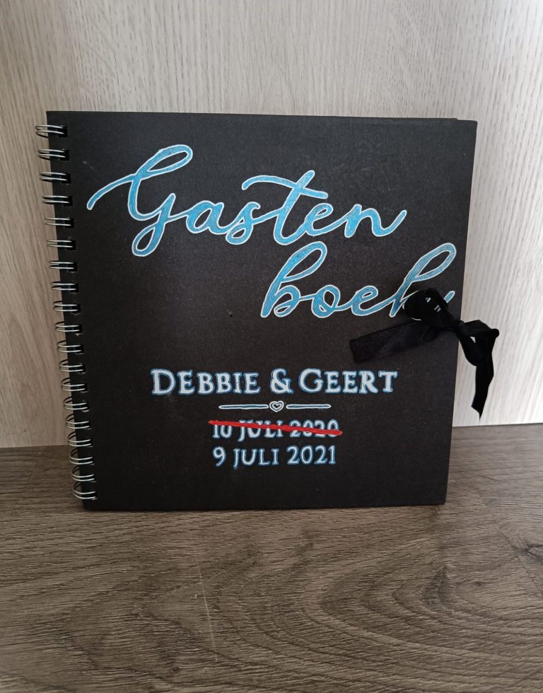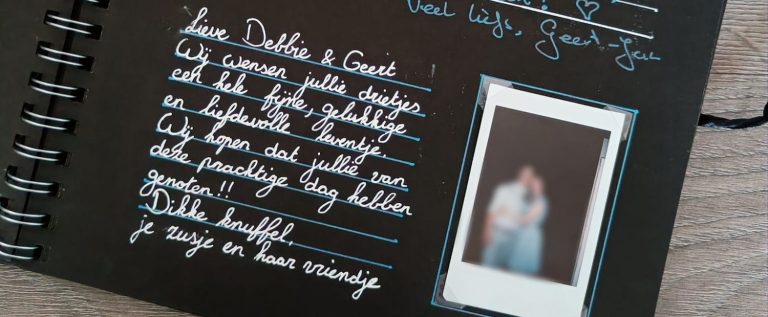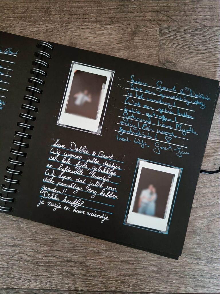 Voor ons feest maakte ik zelf een gastenboek. Naast het boek stond een camera waarmee gasten een foto konden maken en die ze direct afdrukten. De foto konden ze zelf inplakken en er een lief, grappig of gekke boodschap bij schrijven. Een prachtig aandenken met mooie bemoedigende woorden.