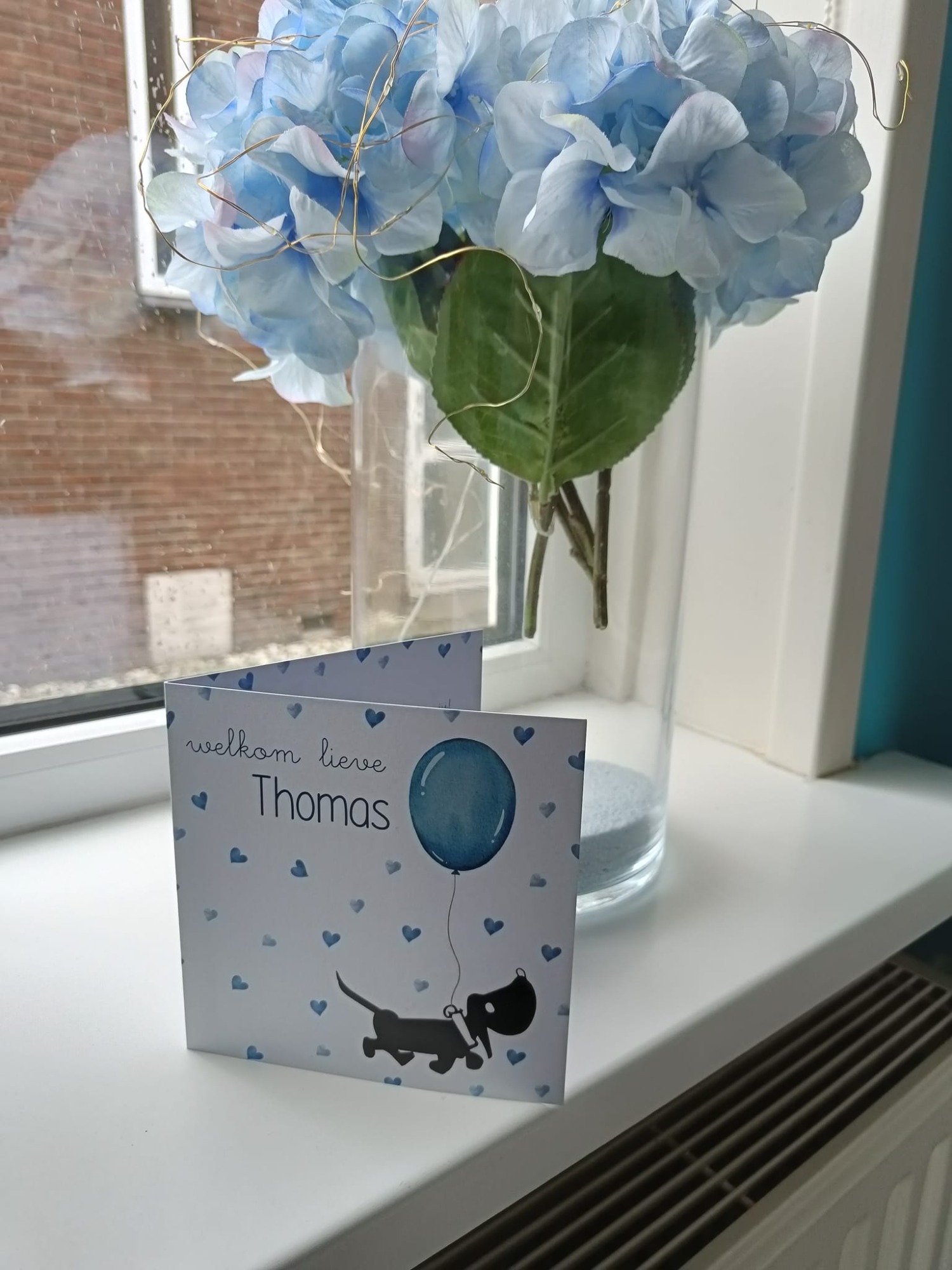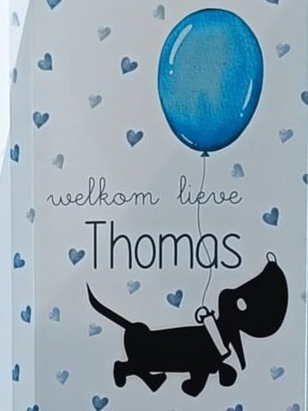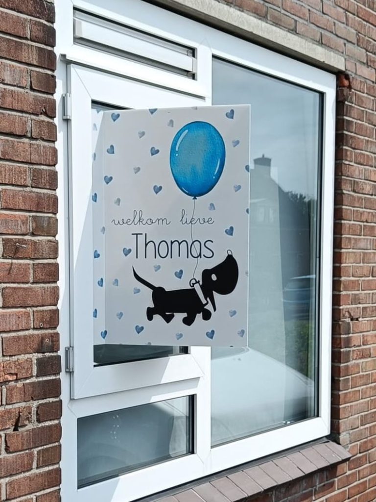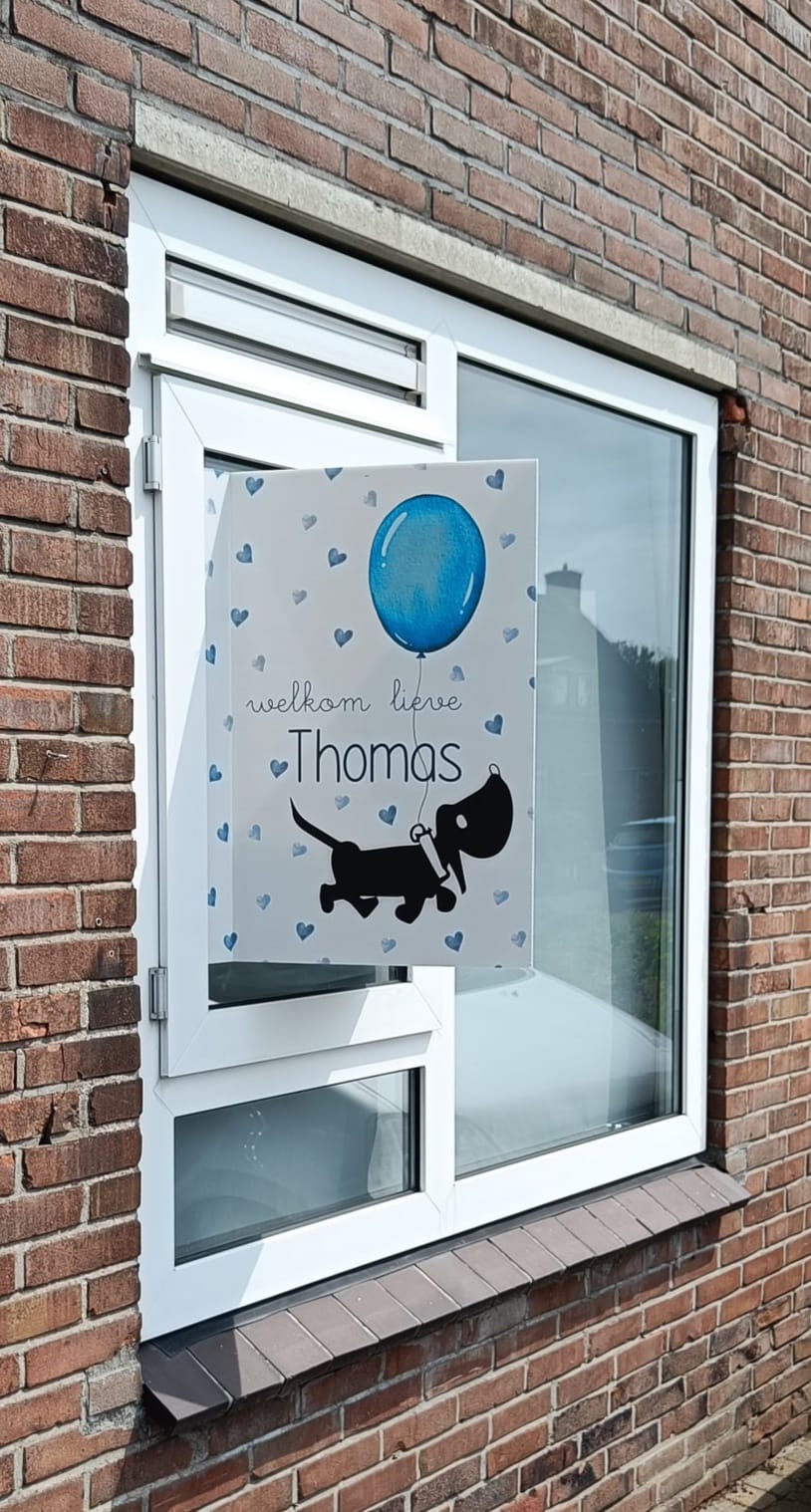 Ik heb voor Thomas ook een geboortebord ontworpen voor aan het raam. Met dezelfde lieve teckel en ballon als op het kaartje, alles in 1 stijl.