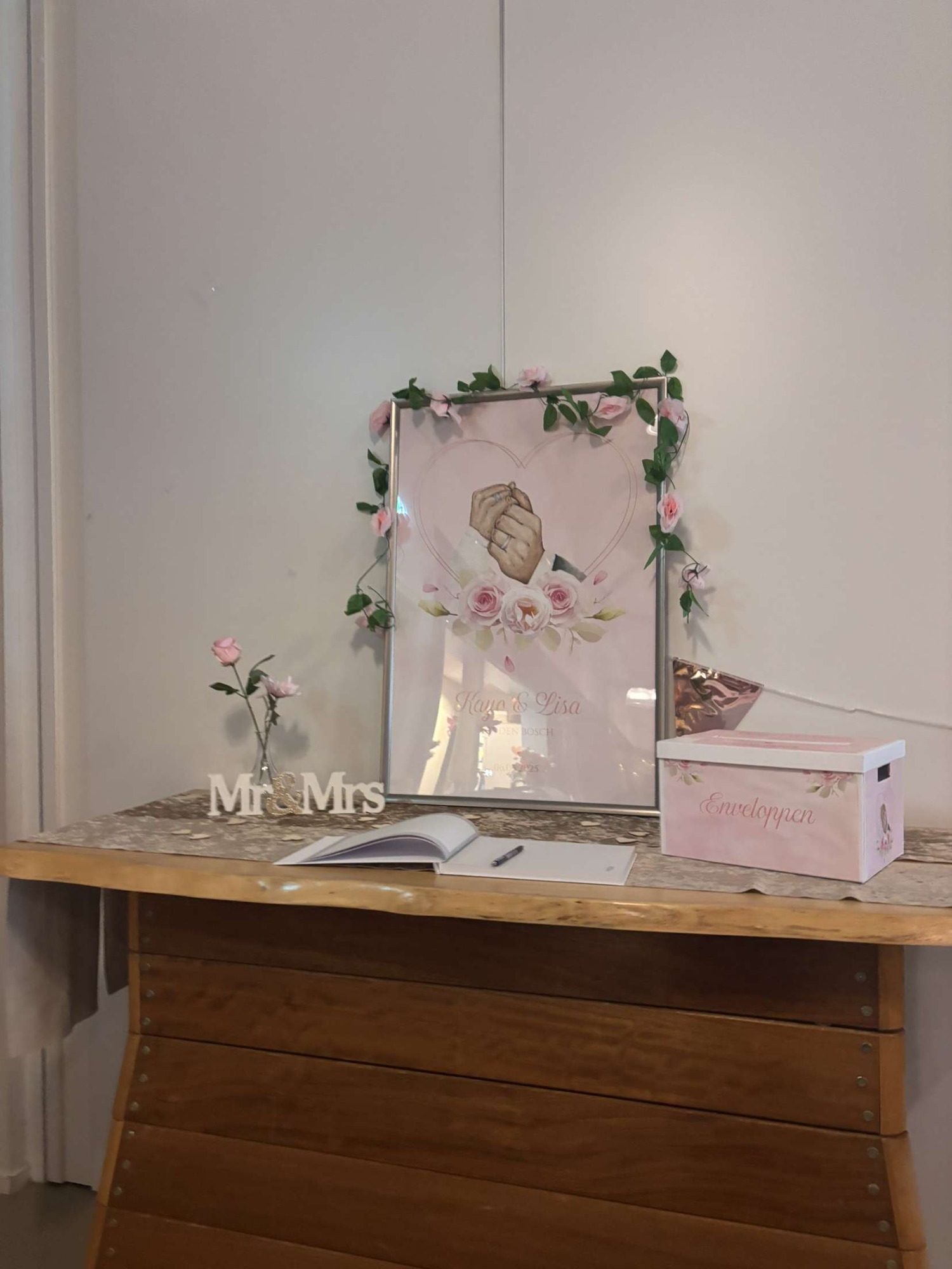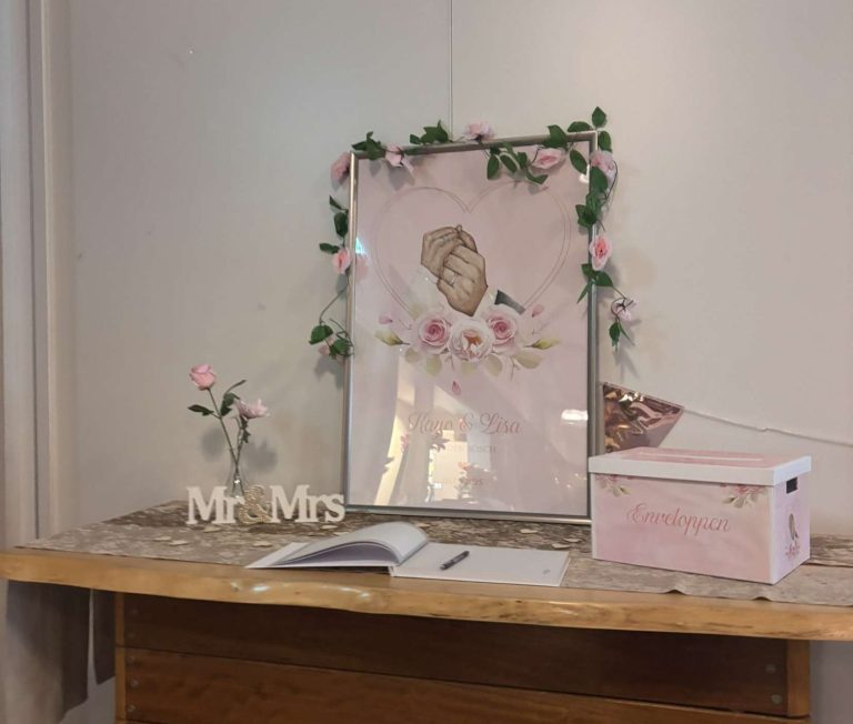 Voor deze bruiloft mocht ik de complete vormgeving doen. De trouwkaart, trouwaktes, spelkaarten, enveloppendoos, poster, cadeau bedankjes en een fotokader.