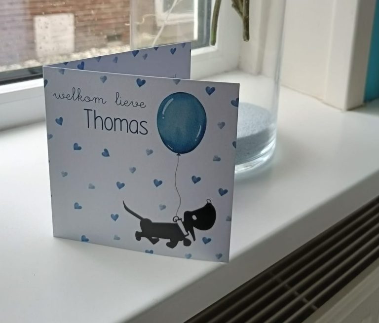 Voor mijn eigen pasgeboren zoontje ontwierp ik een lief en speels geboortekaartje, met in de hoofdrol een teckel met een ballon. Een vrolijk ontwerp dat perfect past bij ons kleine wondertje.